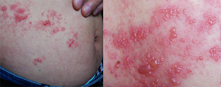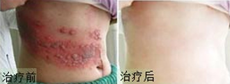 治疗前:腰上可见很多小水疱,少数有破裂糜烂,常有烧灼和痛痒感。