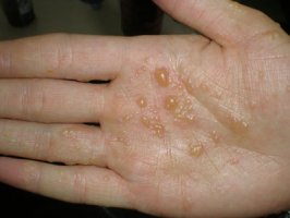 多为单侧起病。先从手掌的某一部位开始,为针头大小的水疱,壁厚且发亮,内含清澈的液体。水疱成群聚集或疏散分布,自觉瘙痒。水疱干后脱屑并逐渐向四周蔓延扩大,形成环形或多环形损害,边缘较清楚。病程多慢性,可持续多年,直到累及全部手掌并传播至手背和指甲,甚至对侧手掌。有时水疱可继发感染形成脓疱。与足癣相比,手癣较少继发严重的细菌感染。