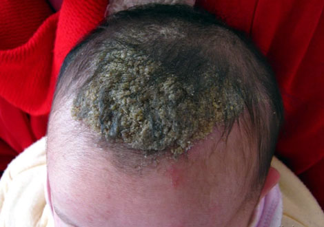 1、头皮:开始为大片灰白色糠秕状或油腻性鳞屑性斑片,以后逐渐扩展融合成界清楚的大斑片,严重者全头皮均覆有油腻性臭味与厚痂并可伴有脂溢性脱发。